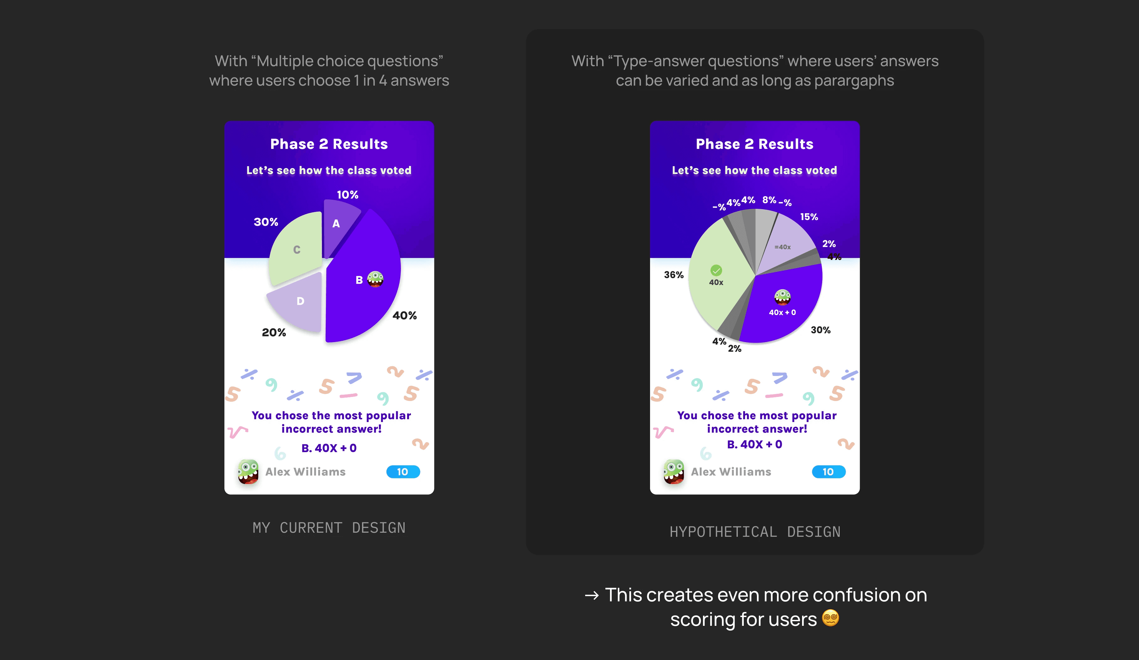 I sketched 20 concepts exploring ways to visualize correct and incorrect answers with clear scoring and engaging animations. At this stage, I prioritized problem-solving over visual consistency between Phase 1 and 2. After feedback from our senior designer, PM, and Educator Advisor, I narrowed them down to 4 ideas and built hifi wireframes for testing with our visual users.